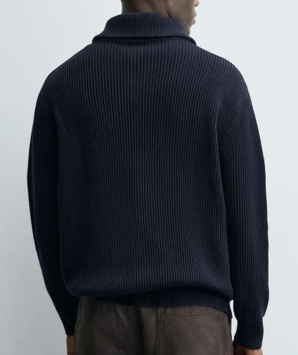 Open Front Polo Neck Long Sleeve Man Knitted Sweater Relaxed Fit High Quality Ribbed Pullover Knitted Sweater Solid Color